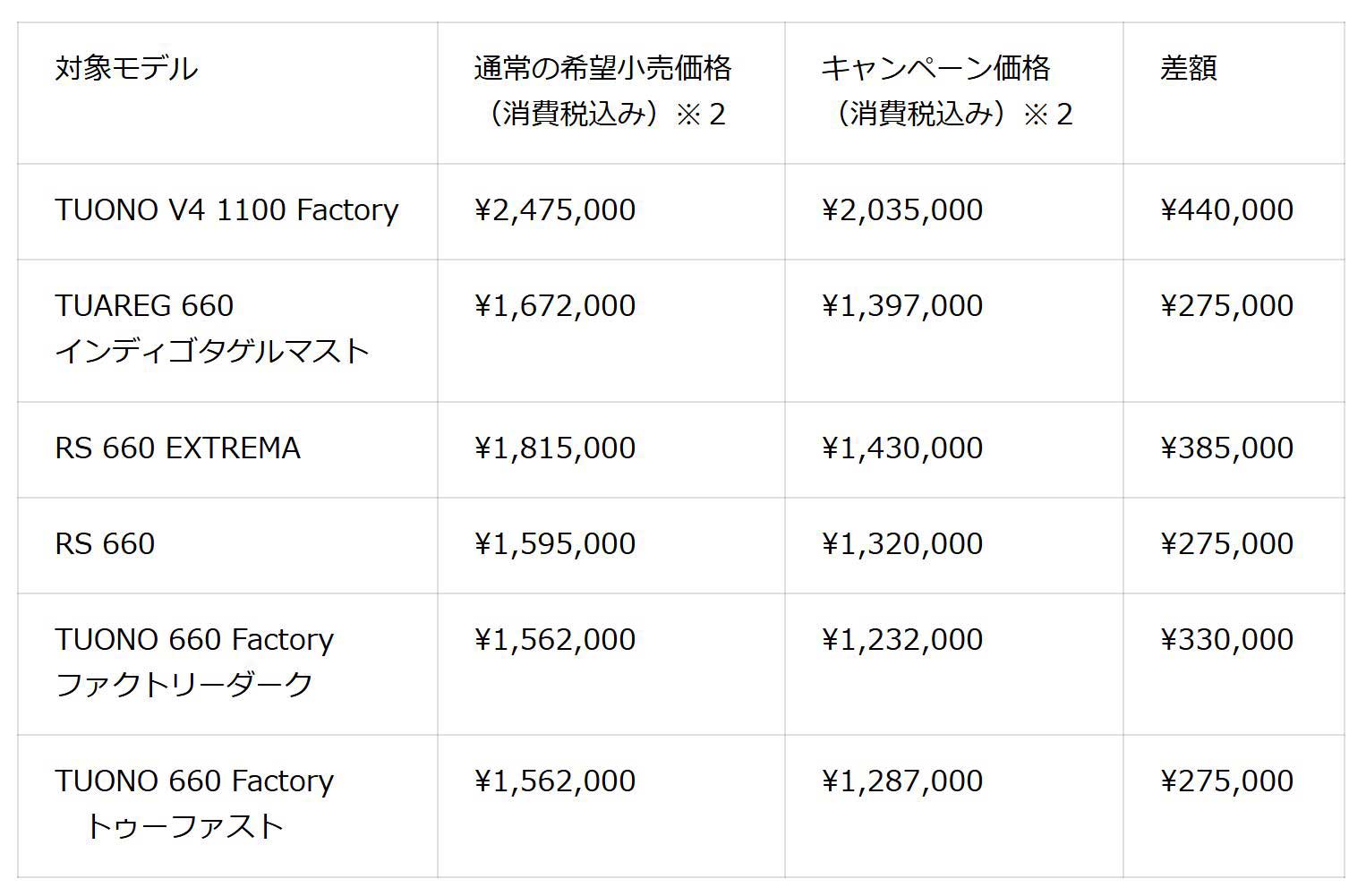 キャンペーンの特典として、通常希望小売価格より最大44万円(税込)も割引されるモデルが用意されている。また、正規販売店で見積依頼をした人の中から抽選で、aprilia純正のalpinestars製レザージャケット(希望小売価格96,800円)が毎月1名にプレゼントされる企画も含まれている。これにより、スポーツバイクライフを楽しむことを応援する内容となっている。